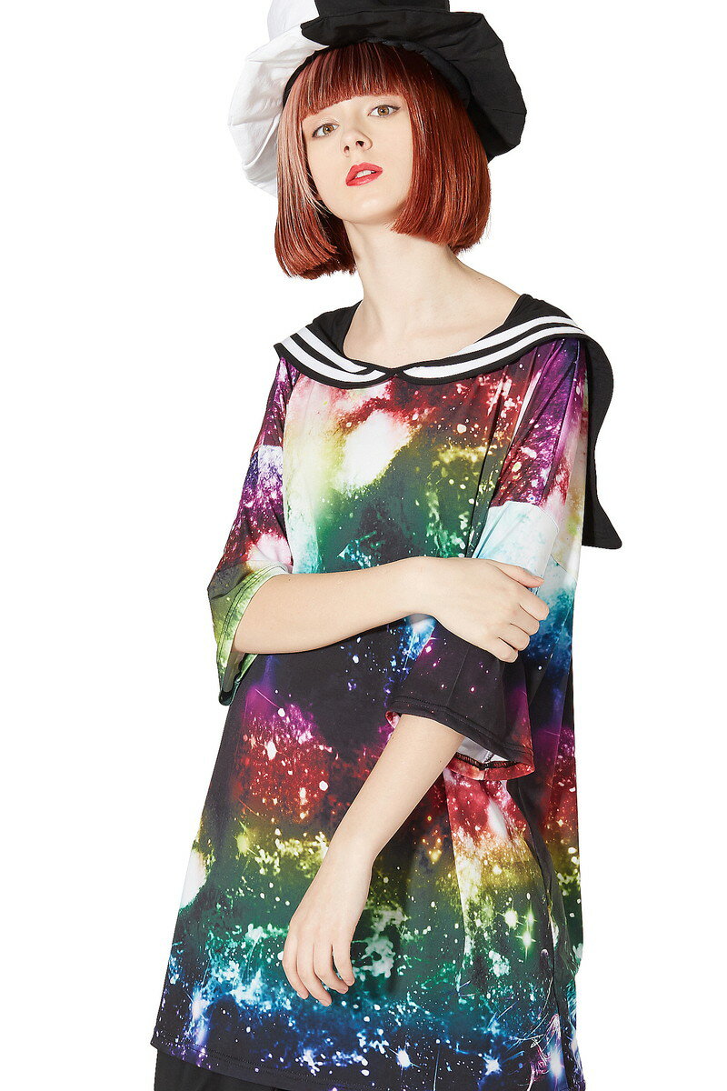 オーバーサイズ/ビッグシルエットを生かして女の子はワンピースとして着ても◎幻想的で浮遊感溢れるアッパーな銀河が広がる宇宙柄がファンタスティック。