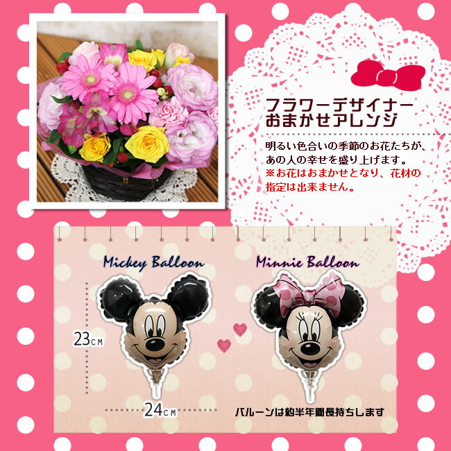 メッセージカード付き カラー:ピンク【あす楽対応_関東】【あす楽対応_甲信越】【あす楽対応_北陸】【あす楽対応_東海】【あす楽対応_近畿】【あす楽対応_中国】【あす楽対応_四国】【あす楽対応_東北】【あす楽対応_九州】商品詳細 商品名 季節のおまかせアレンジと ミッキー&ミニーバルーンのセット 商品内容 季節のお花を使用したおまかせのアレンジです。